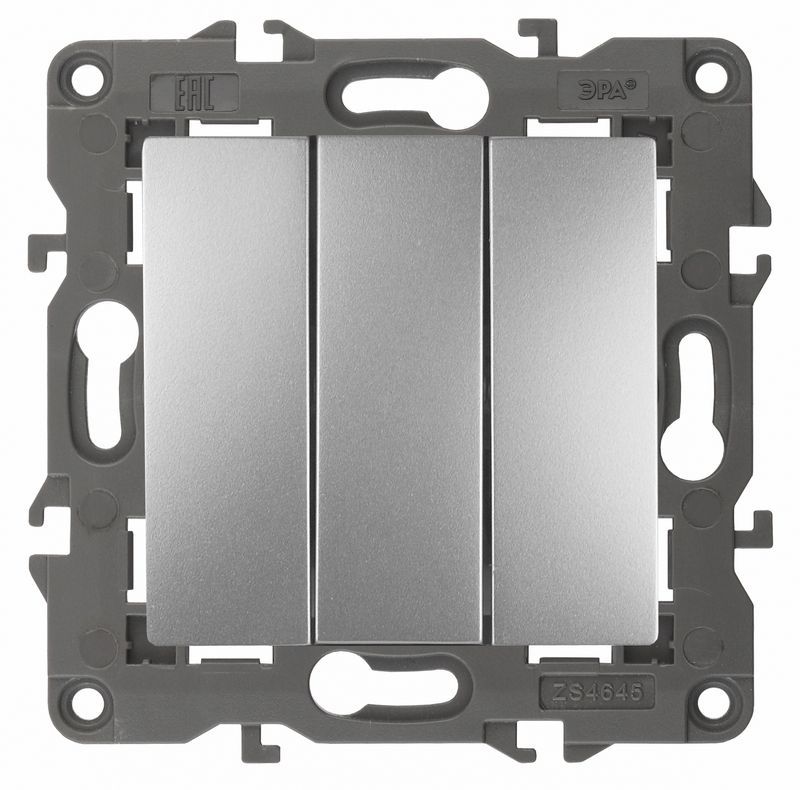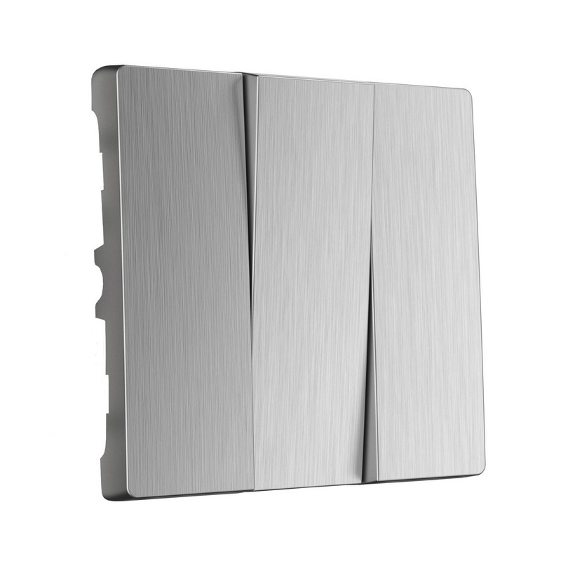 Выключатель трёхклавишный Legrand Etika для скрытого монтажа, номинальный ток 10 А, цвет алюмний. Предназначен для независимого управления тремя нагрузками с одного места. Подходит для управления многорожковыми люстрами и осветительными приборами с большим количеством ламп.Особенности:- Материал клавиш-глянцевый AБС пластик, стоек к выгоранию и загрязнениям.- Ход клавиш чёткий, не громкий.- Все токоведущие части выключателя имеют защиту от случайного прикосновения- Для присоединения проводов применены винтовые зажимы.Особенности серии Etika: - Корпус механизма- высококачественный поликарбонат, не проводит электрический ток, не поддерживает горение, ударопрочен.- Специальный профиль внешнего контура механизма обеспечивает простоту и безошибочность многопостового монтажа. - Острые крепёжные лапки с широким углом раскрытия обеспечивают надёжную фиксацию в монтажной коробке.