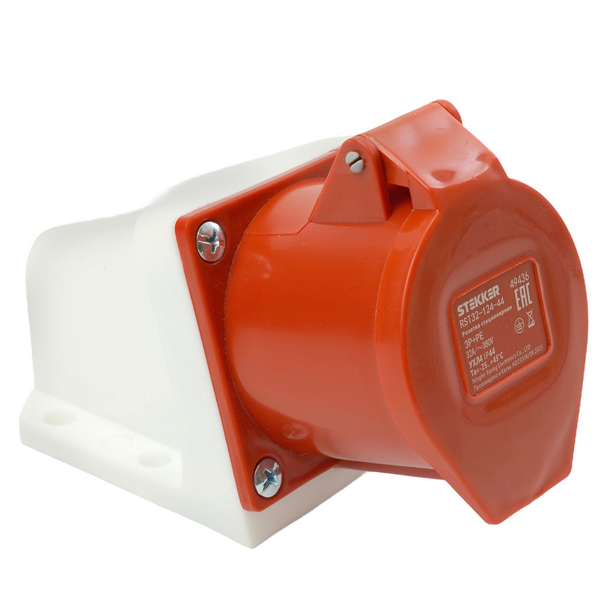 Розетка  STEKKER RST32-125-44 на 1 гнездо, с крышкой, -. Материал: PP, цвет красный, размер 153*71*107мм. Номинальное напряжение 380, номинальный ток 32А, диапазон рабочих температур -25°C - +45°C, 44