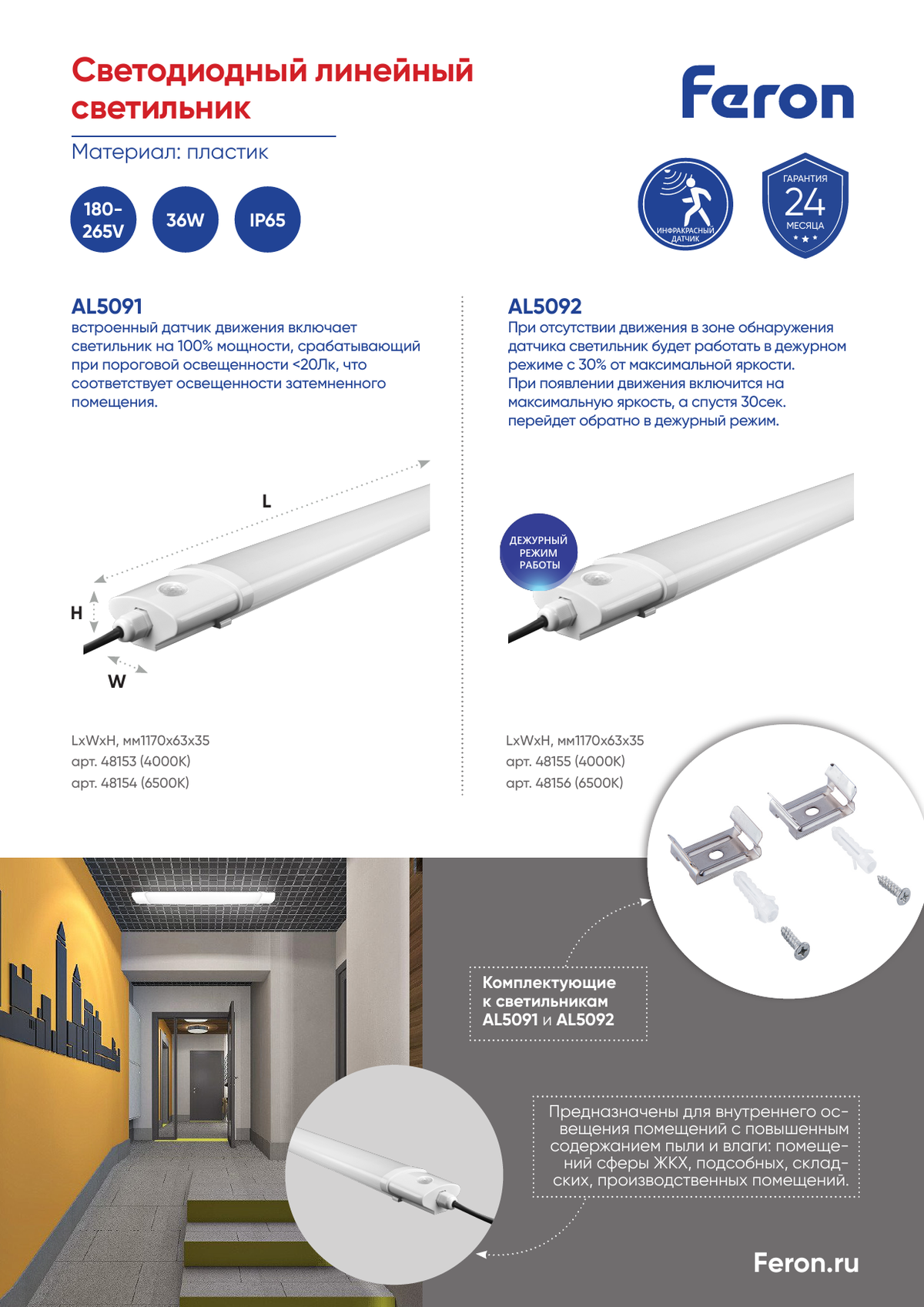 Светильник светодиодный Feron AL5092 линейный с ИК-датчиком 36W 4000K IP65 белый 48153 по цене 1 358 руб. с фотографией и техническими характеристиками. Для покупки товара нажмите кнопку "Купить" и перейдите в корзину или позвоните по телефону 8 (495) 585 32 60 или 8 (800) 222 23 53.