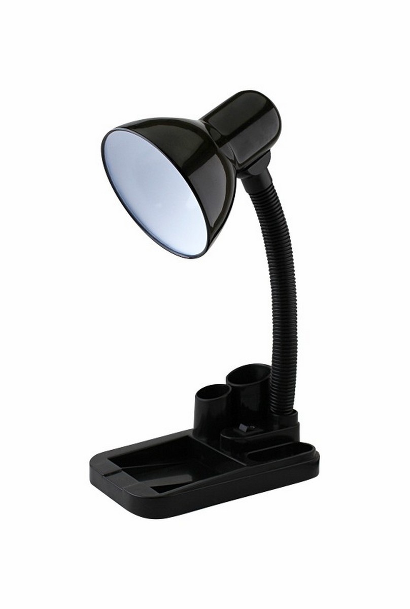 Конструкция: Плафон выполнен из металла, трубка-держатель из полимерного материала с металлическими элементами. На основании расположена кнопка включения/выключения. Светильник оснащен пластиковой подставкой-пеналом для канцтоваров. Предназначен для использования с лампами с цоколем Е27.