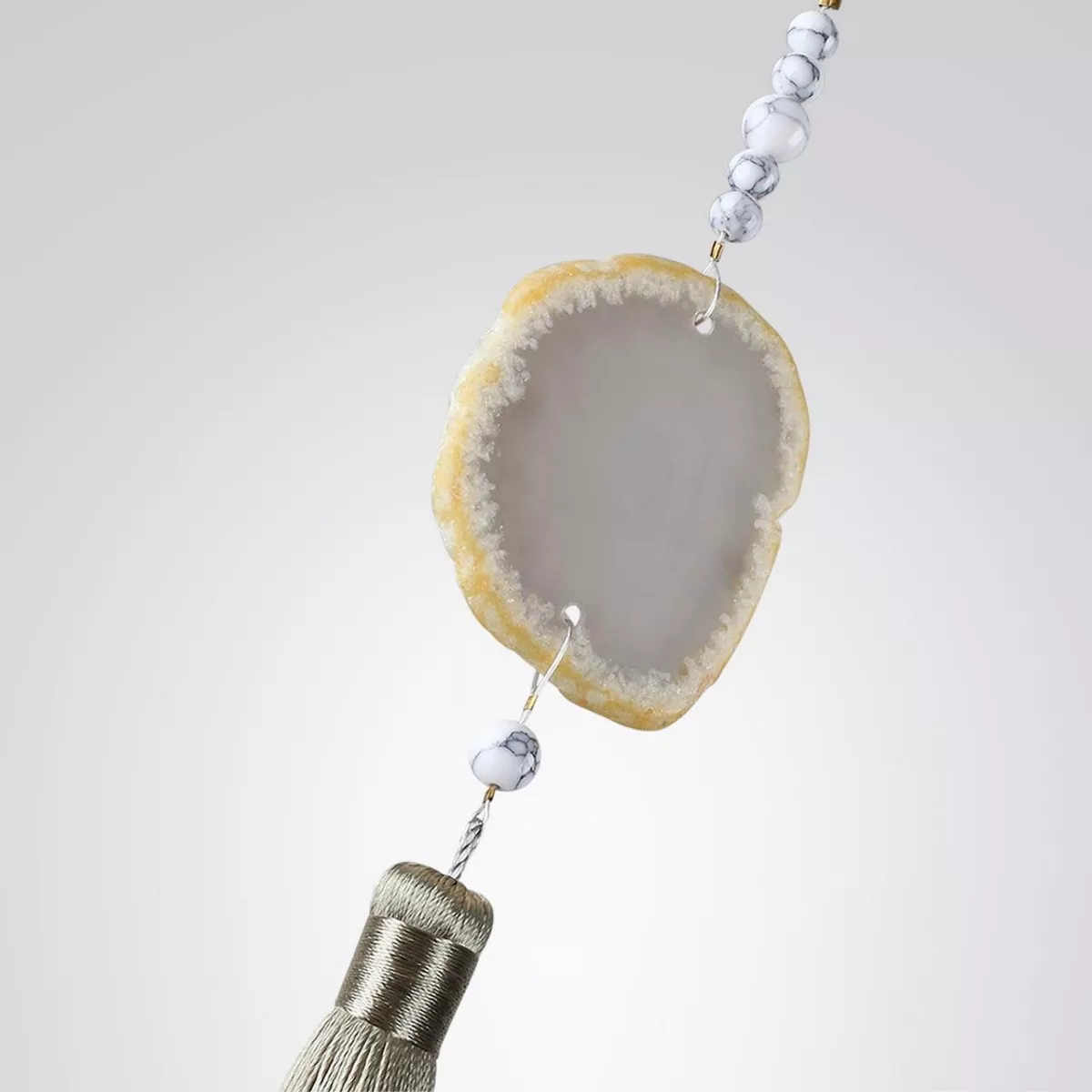 Линия FIOLENT ― нежная серия в неоклассическом стиле, где главный декоративный элемент ― это струящиеся шелковистые кисти и натуральный агат в обрамлении бусин и других элементов из камня говлит, стекла и металла. Стеклянные плафоны украшены паттерном, напоминающим мраморные узоры. Люстра и подвесной светильник могут регулироваться по высоте.