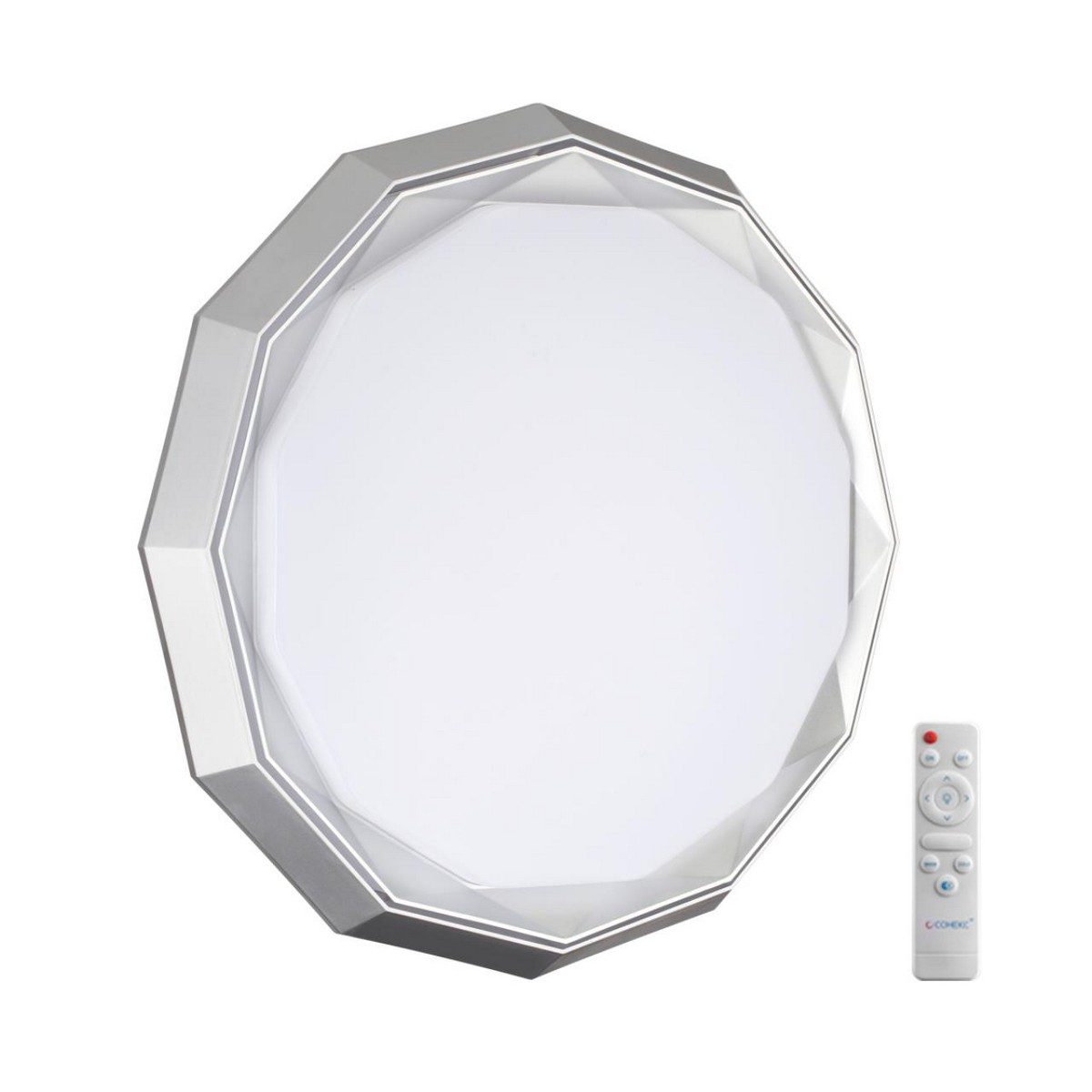 Светильник 7671/DL линии VAXIN состоит из металлического основания (базы) и пластикового рассеивателя. Материал рассеивателя - высококачественный пластик марки PMMA 2.0 белого цвета с матовой поверхностью. Пластик обеспечивает светильнику равномерное рассеивание и хорошее светопропускание. Форма плафона: круглая, декорирована ободом из пластика, рельефной структуры, цвет хром. Степень защиты IP43 позволяет использовать светильник в определенных зонах влажных помещений. В комплект входит заменяемый LED модуль с линзами, мощностью 48Вт, которая соответствует лампе накаливания 440Вт. А также пульт ДУ (с креплением на стену), с помощью которого осуществляется плавное изменение цветовой температуры 3000-6000К, изменение яркости, переход в режим переключения теплого/белого/холодного/ночного света. Светильник имеет функцию "память".