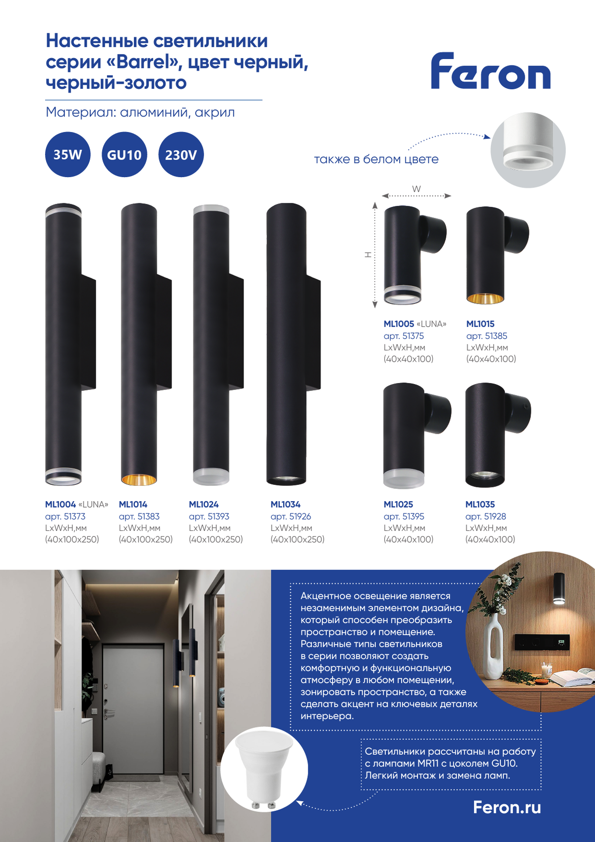 Светильник Feron ML1005 LUNA настенно-потолочный GU10 черный 51375 по цене 685 руб. с фотографией и техническими характеристиками. Для покупки товара нажмите кнопку "Купить" и перейдите в корзину или позвоните по телефону 8 (495) 585 32 60 или 8 (800) 222 23 53.