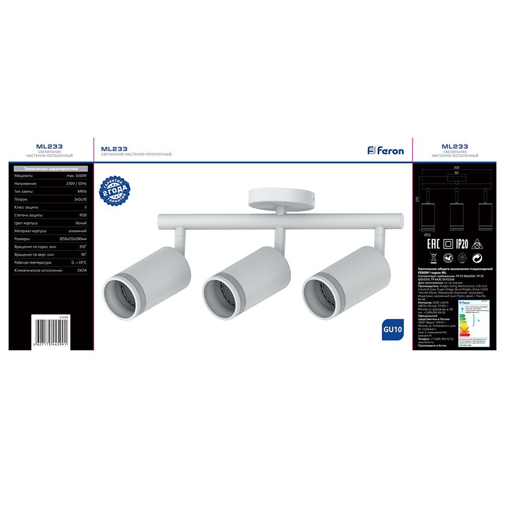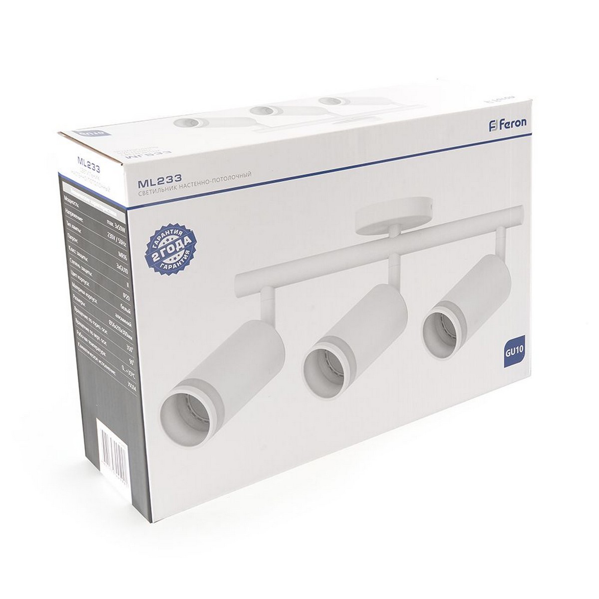 Современный светильник спот создаст уютное освещение в любом интерьере. Можно использовать как основное или акцентное освещение в любом помещении. Модель ML233 от производителя Feron в цвете Белый и типом лампы GU10 которая обеспечивает мощность 150 Ватт обеспечит Вас качественным светом. А универсальный крепеж (в комплекте) позволяет установить светильник на любую поверхность. Светильник накладной под лампу, (ИВО) FERON ML233, 3*GU10 3*50W, 230V, IP20, цвет белый, корпус алюминий, 300*56*210