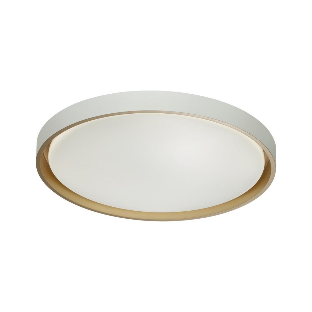 Светильник 7645/ELN линии KISIL состоит из металлического основания (базы) и пластикового рассеивателя. Материал рассеивателя ― высококачественный пластик марки PMMA 2.0 белого цвета с матовой поверхностью. Пластик обеспечивает светильнику равномерное рассеивание и хорошее светопропускание. Форма плафона: круглая, декорирована ободом из пластика золотистого цвета с внутренней стороны и белого цвета с внешней стороны. Степень защиты IP43 позволяет использовать светильник в определенных зонах влажных помещений. В комплект входит LED-модуль с линзами мощностью 76 Вт, соответствующей лампе накаливания 740 Вт, а также переключатель температуры цвета (ССT) на драйвере, с помощью которого осуществляется изменение цветовой температуры 3000/4000/6000 К и переход светильника в режим теплого/белого/холодного света. Для установки необходимого режима рекомендуется использовать удлиненный тонкий предмет типа небольшой отвертки.