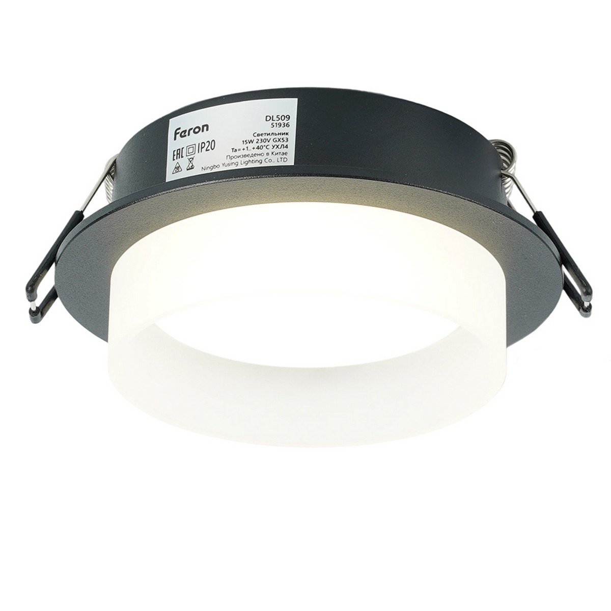 Светильник встраиваемый Feron DL509 потолочный GX53 черный 51936 по цене 432 руб. с фотографией и техническими характеристиками. Для покупки товара нажмите кнопку "Купить" и перейдите в корзину или позвоните по телефону 8 (495) 585 32 60 или 8 (800) 222 23 53.