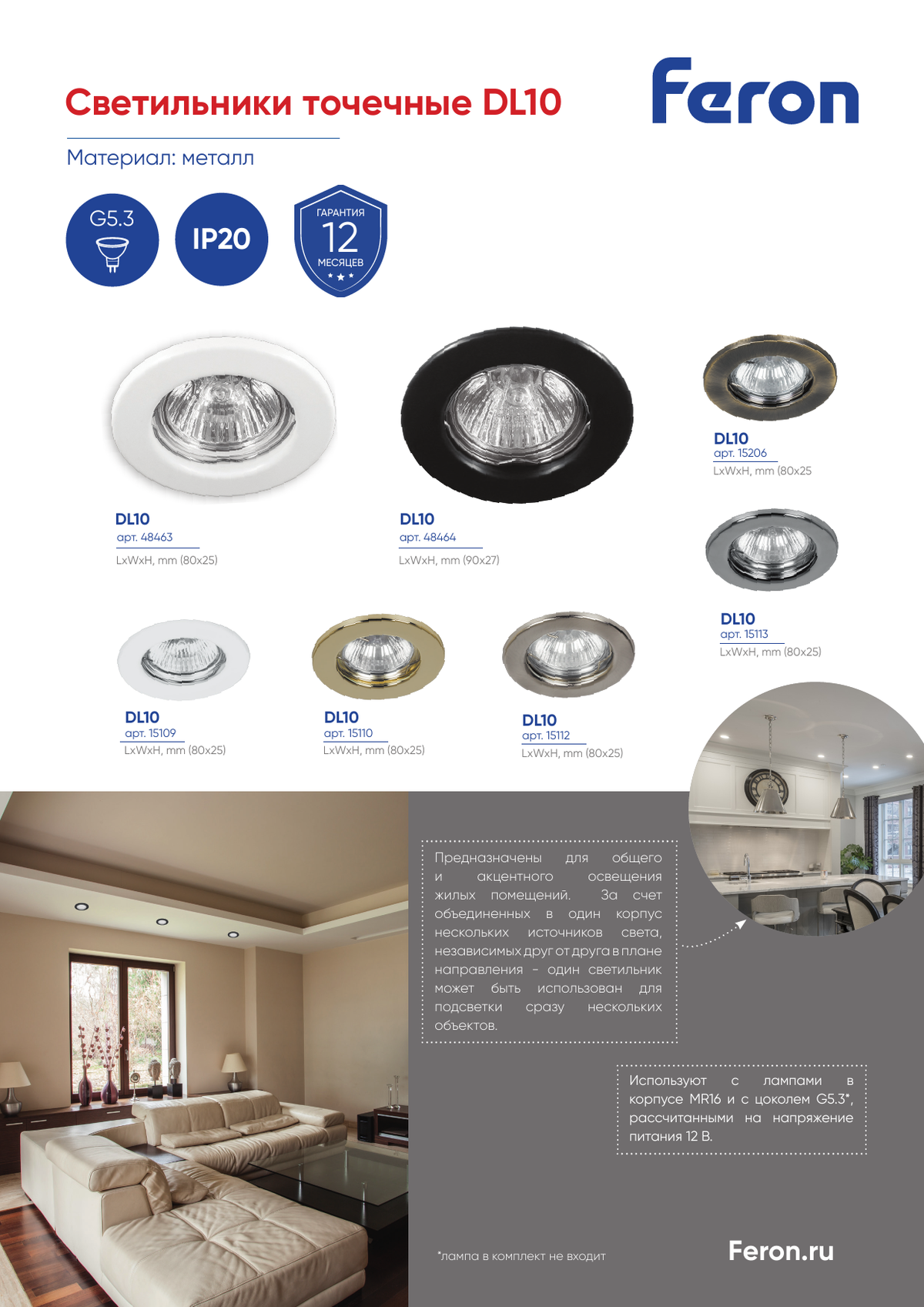 Светильник потолочный встраиваемый Feron DL10 MR16 50W G5.3 белый матовый 48463 по цене 63 руб. с фотографией и техническими характеристиками. Для покупки товара нажмите кнопку "Купить" и перейдите в корзину или позвоните по телефону 8 (495) 585 32 60 или 8 (800) 222 23 53.