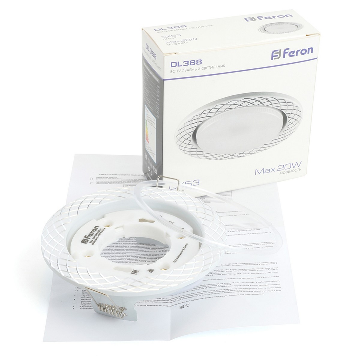Светильник встраиваемый Feron DL388 GX53 белый 29715 по цене 186 руб. с фотографией и техническими характеристиками. Для покупки товара нажмите кнопку "Купить" и перейдите в корзину или позвоните по телефону 8 (495) 585 32 60 или 8 (800) 222 23 53.