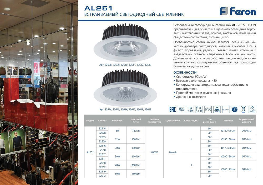 Современный светодиодный светильник Feron AL251 20W представляет собой эффективное решение для создания равномерного нейтрально-белого освещения (4000K) в любом помещении. С интенсивностью светового потока 1800 лм и углом рассеивания 90 градусов, этот круглый встраиваемый светильник идеально подходит для монтажа в различных типах потолков, благодаря универсальным размерам 160x160x62 мм.