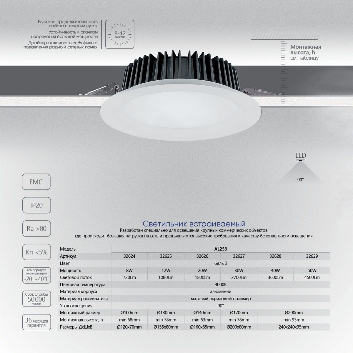 Светильник Feron AL253 подходит как для жилых, так и для коммерческих помещений, где необходима надёжная и экономичная система освещения. Работает от сети 220V, что делает его легким в инсталляции и эксплуатации. Выбор этого светильника — это ваш шаг к эффективному и стильному освещению.