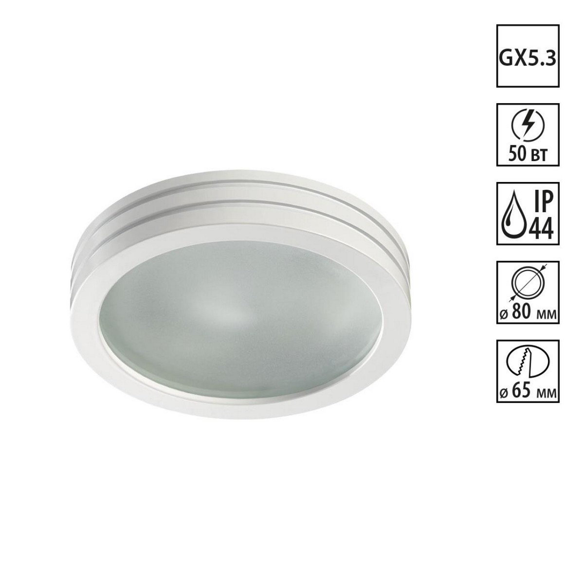 Встраиваемый неповоротный светильник с повышенной степенью пылевлагозащиты (IP44) подходит для установки во влажные помещения. Лампа в комплект не входит.