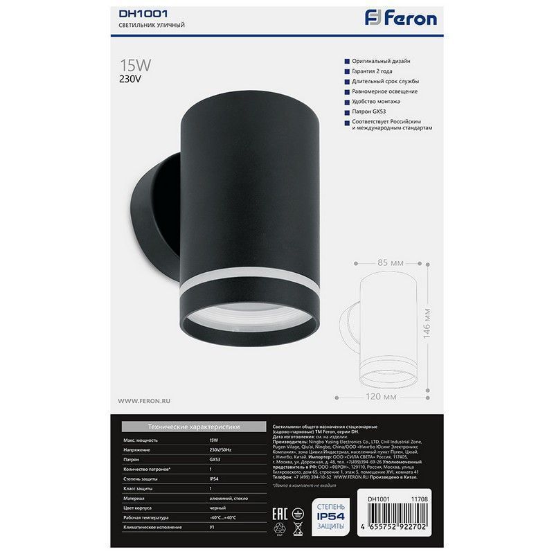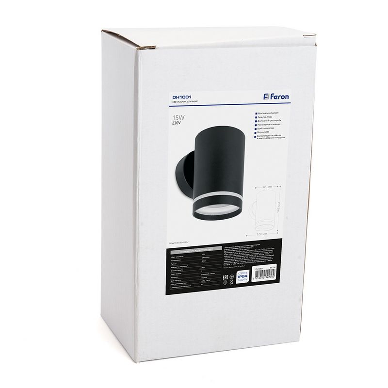 Установка на стену делает Feron DH1001 удобным в монтаже и эксплуатации, а его размеры (120*85*146мм) позволяют разместить его почти в любом желаемом месте. Этот светильник идеален для тех, кто ищет надежное и стильное решение для освещения наружных пространств.