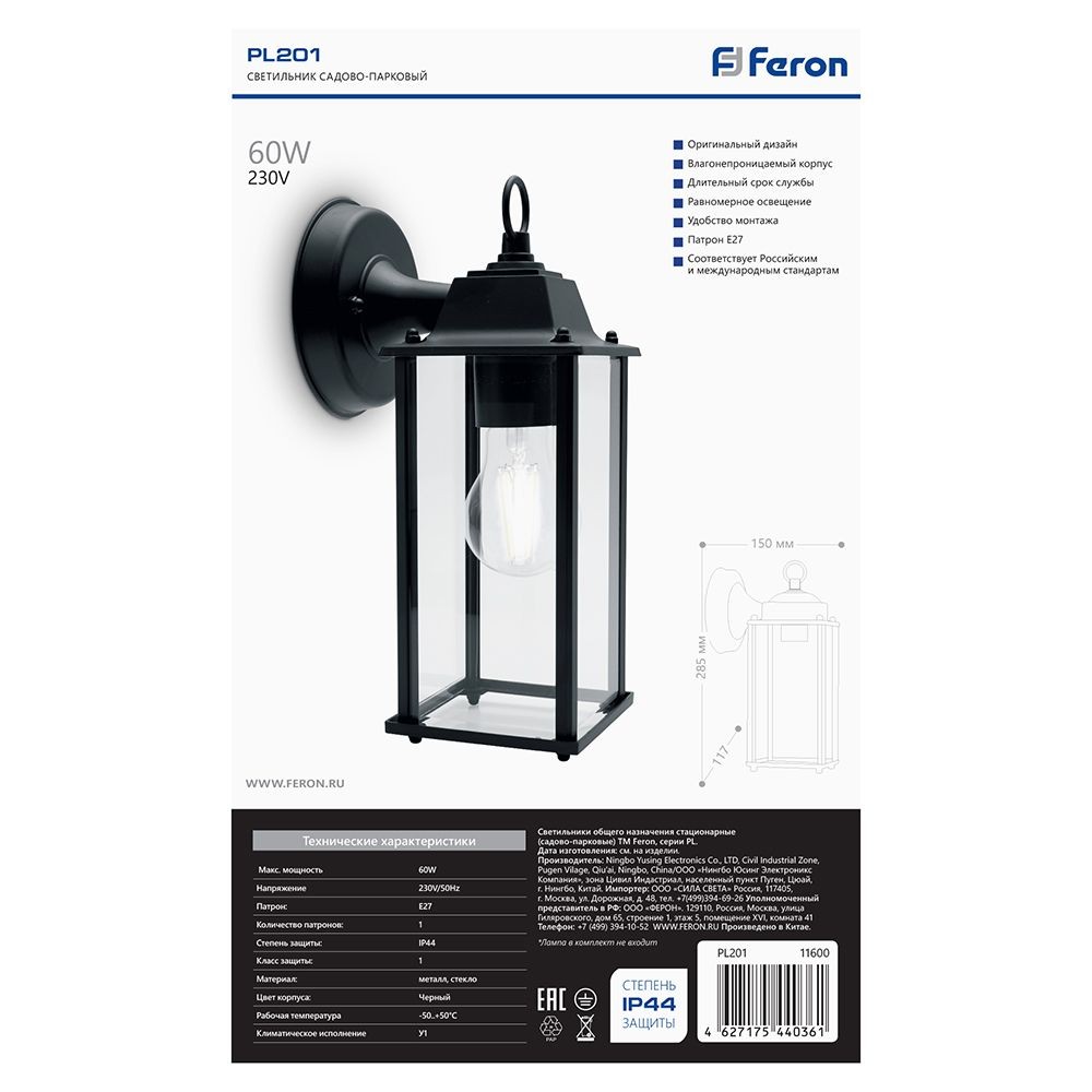 Светильник садово-парковый Feron PL201 на стену вниз 60W E27 230V черный 11600 по цене 2 166 руб. с фотографией и техническими характеристиками. Для покупки товара нажмите кнопку "Купить" и перейдите в корзину или позвоните по телефону 8 (495) 585 32 60 или 8 (800) 222 23 53.