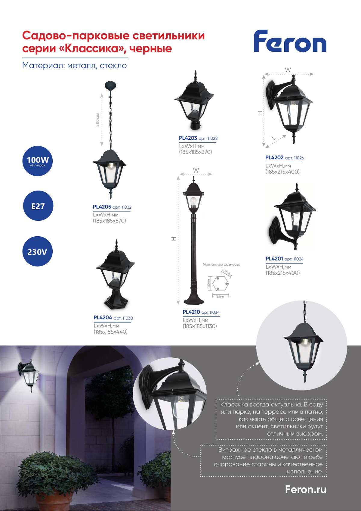 Светильник Feron 4203 имеет степень защиты IP44, что обеспечивает надежную работу в различных погодных условиях. Габариты изделия составляют 185*185*370мм, что делает его заметным, но не перегруженным элементом на любом участке. Эта модель – отличное решение для тех, кто ищет надежный и стильный светильник для освещения улицы или сада.