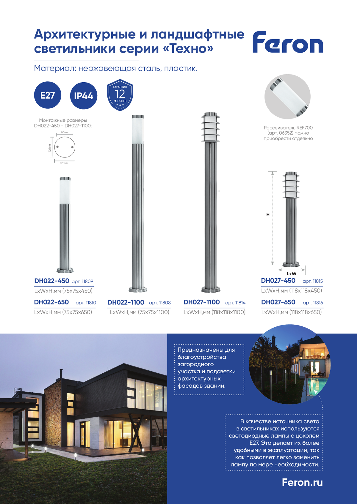 Светильник садово-парковый Feron DH022-450 Техно столб 18W E27 230V серебро 11809 по цене 1 666 руб. с фотографией и техническими характеристиками. Для покупки товара нажмите кнопку "Купить" и перейдите в корзину или позвоните по телефону 8 (495) 585 32 60 или 8 (800) 222 23 53.