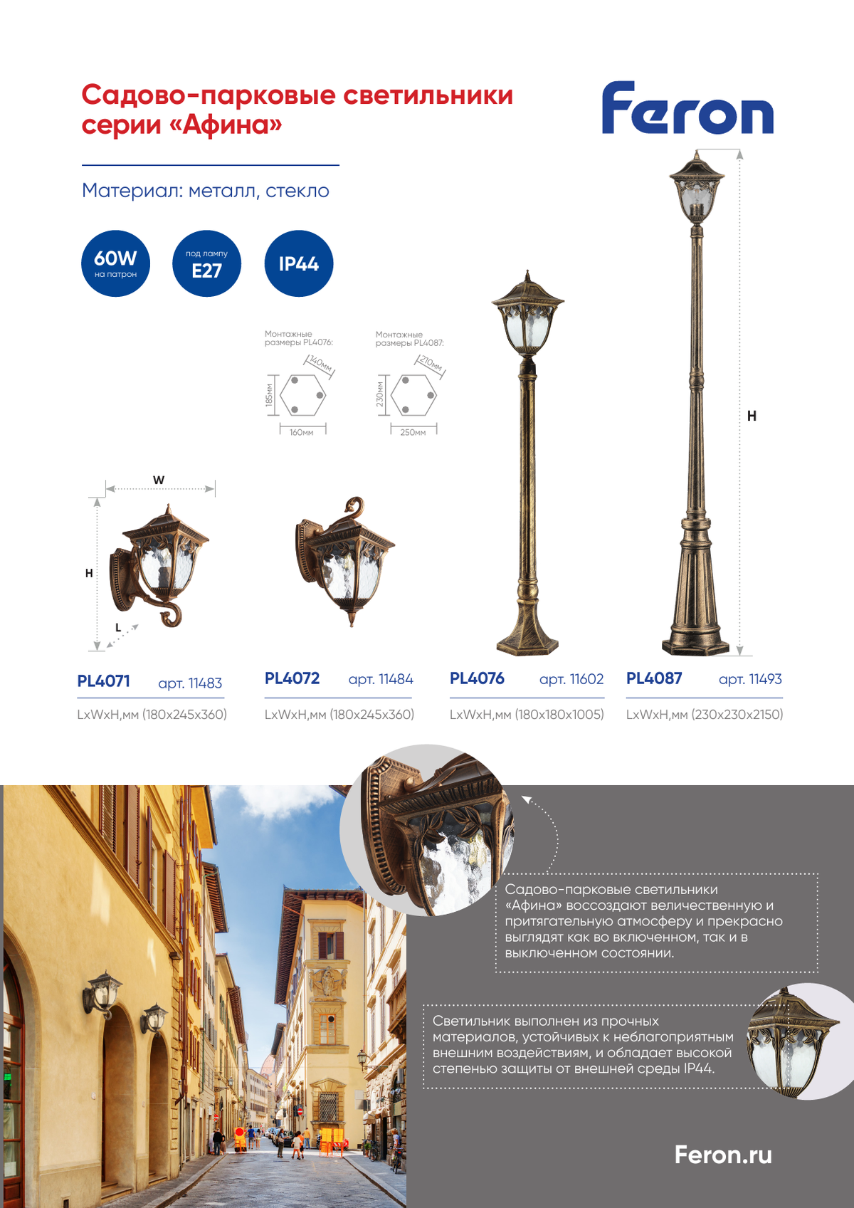 Сделанный из высококачественных материалов, металла и стекла, Feron PL4076 не подвержен коррозии и прекрасно подходит для использования в различных климатических условиях. Благодаря классу защиты IP44 светильник защищен от пыли и брызг воды, что делает его идеальным решением для установки на открытых площадках, в саду, на дачном участке или возле дома.