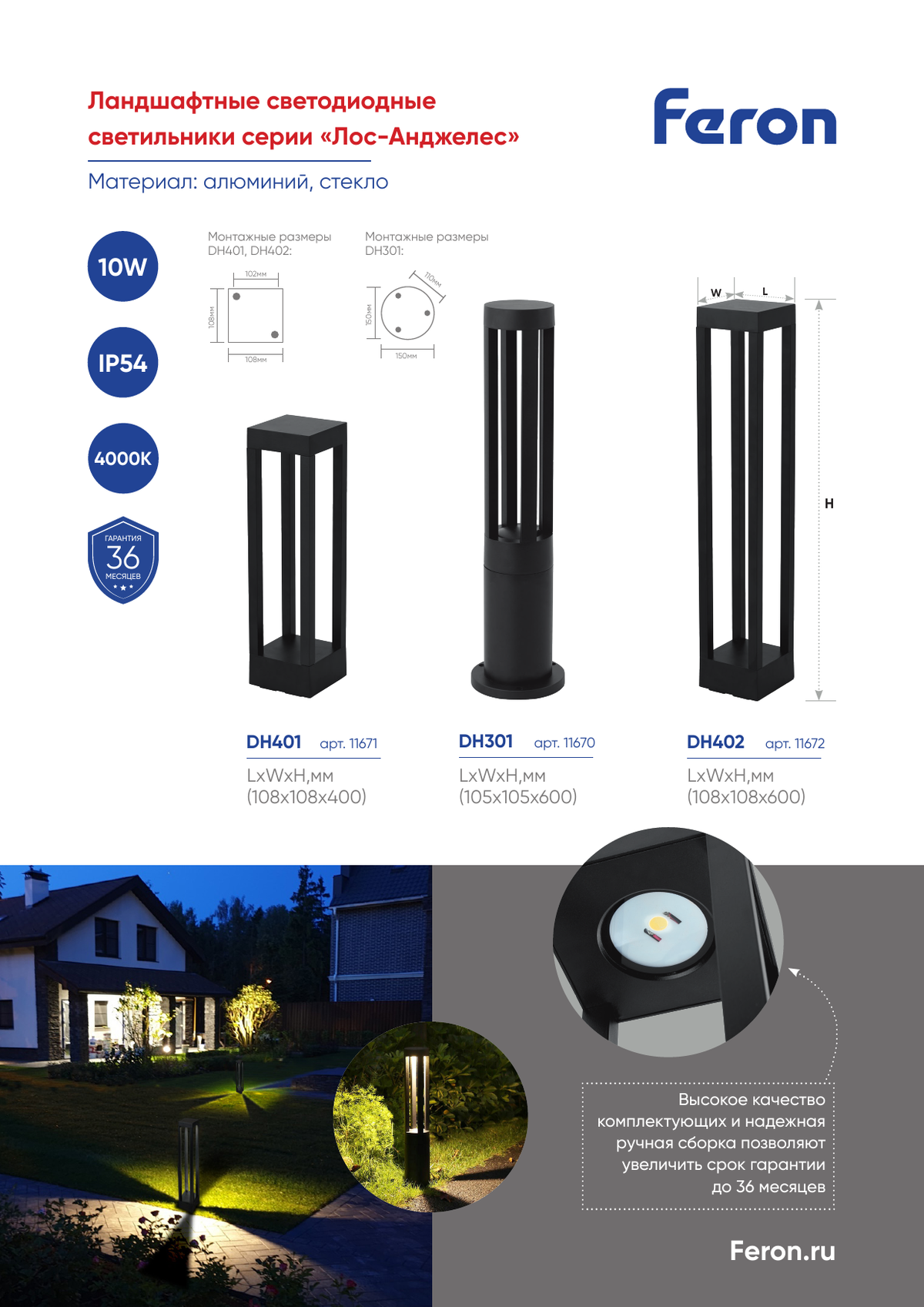Ландшафтно-архитектурные светильники DH402 артикул 11672 серии «Лос-Анджелес» Feron предназначены как для декоративного, так и для общего освещения парковых аллей и лужаек загородных домов.
