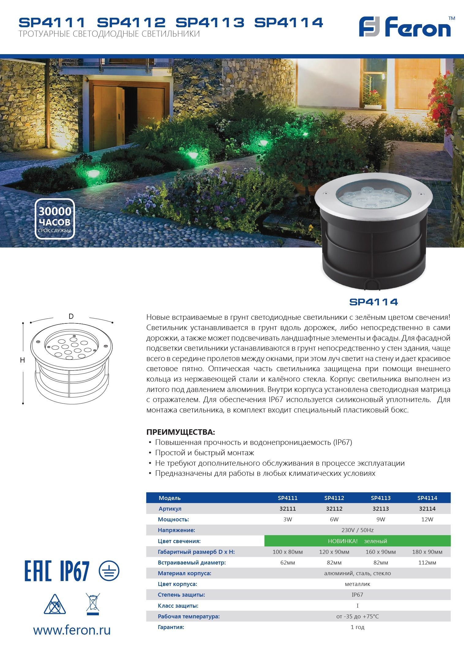 Ландшафтный светильник светодиодный (грунтовый) Feron SP4111 3W 6400K 230V IP67 32013 по цене 1 116 руб. с фотографией и техническими характеристиками. Для покупки товара нажмите кнопку "Купить" и перейдите в корзину или позвоните по телефону 8 (495) 585 32 60 или 8 (800) 222 23 53.