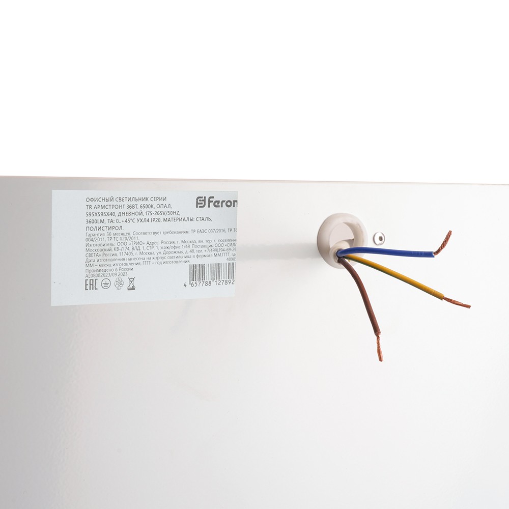 Офисный светильник серии TR Армстронг 36Вт 6500К опал (артикул 48905) от производителя Feron — идеальное решение для офисов и коммерческих помещений. Этот встраиваемый светодиодный светильник предлагает универсальную установку: он подходит для монтажа в потолок типа армстронг, грильятто, а также для накладного монтажа. С мощностью 36Вт и световым потоком 3600 люмен, модель обеспечивает яркое освещение с цветовой температурой 6500K, создавая комфортную рабочую атмосферу. Корпус из качественной стали и рассеиватель из полистирола гарантируют надежность и долговечность. Формат 595x595x40 мм позволяет легко интегрировать светильник в существующие системы освещения. С защитой IP20 и углом рассеивания 120° он подходит для самых разных интерьеров. Эффективный и стильный офисный светильник, отвечающий всем стандартам ГОСТ.