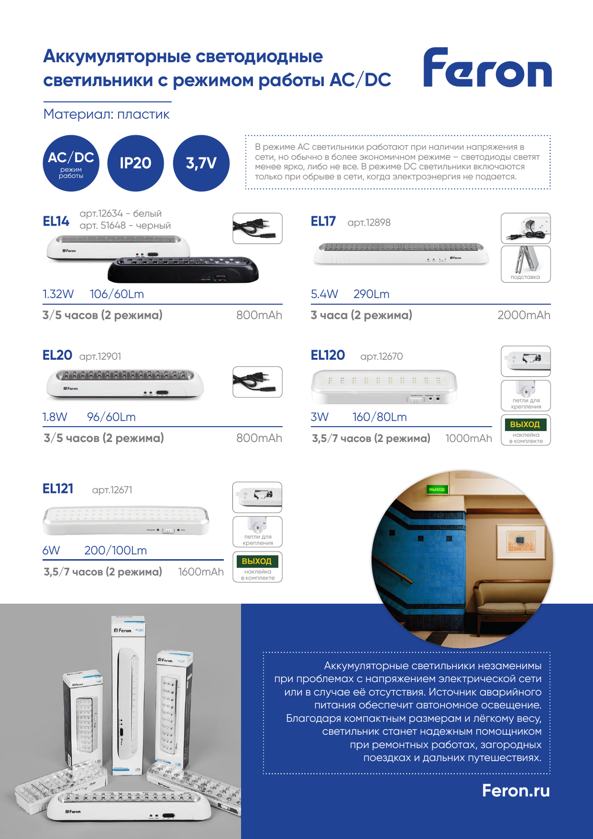 Светильник аккумуляторный Feron EL17 90 LED AC/DC белый 12898 по цене 1 858 руб. с фотографией и техническими характеристиками. Для покупки товара нажмите кнопку "Купить" и перейдите в корзину или позвоните по телефону 8 (495) 585 32 60 или 8 (800) 222 23 53.