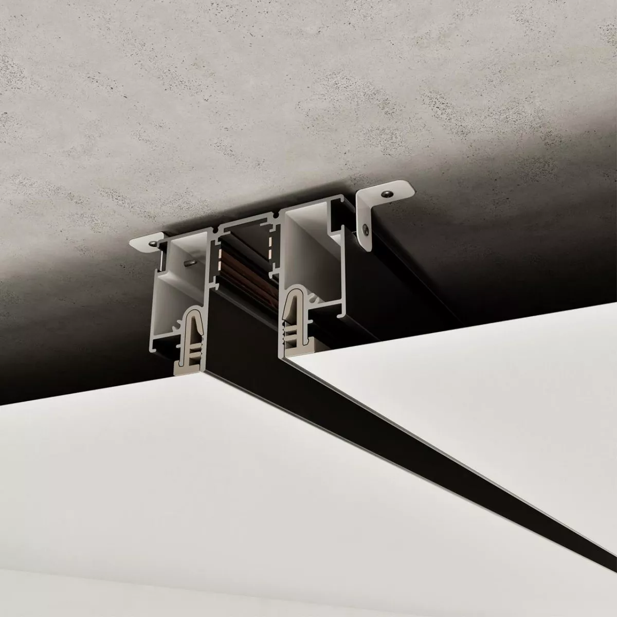 Шинопровод CLAMP for NOVOTECH специально разработан для интеграции в натяжные потолки и совместной работы с низковольтными светильниками FLUM (48В). Эта уникальная система сочетает алюминиевый профиль с токопроводящими жилами и специальную технологию крепления CLAMP, позволяющую легко и надежно зафиксировать тканевые и ПВХ-полотна без риска их повреждения. За счёт увеличенной камеры узла примыкания CLAMP, обеспечивается высокая прочность фиксации и простота монтажа, что выгодно отличает данное решение от аналогов.