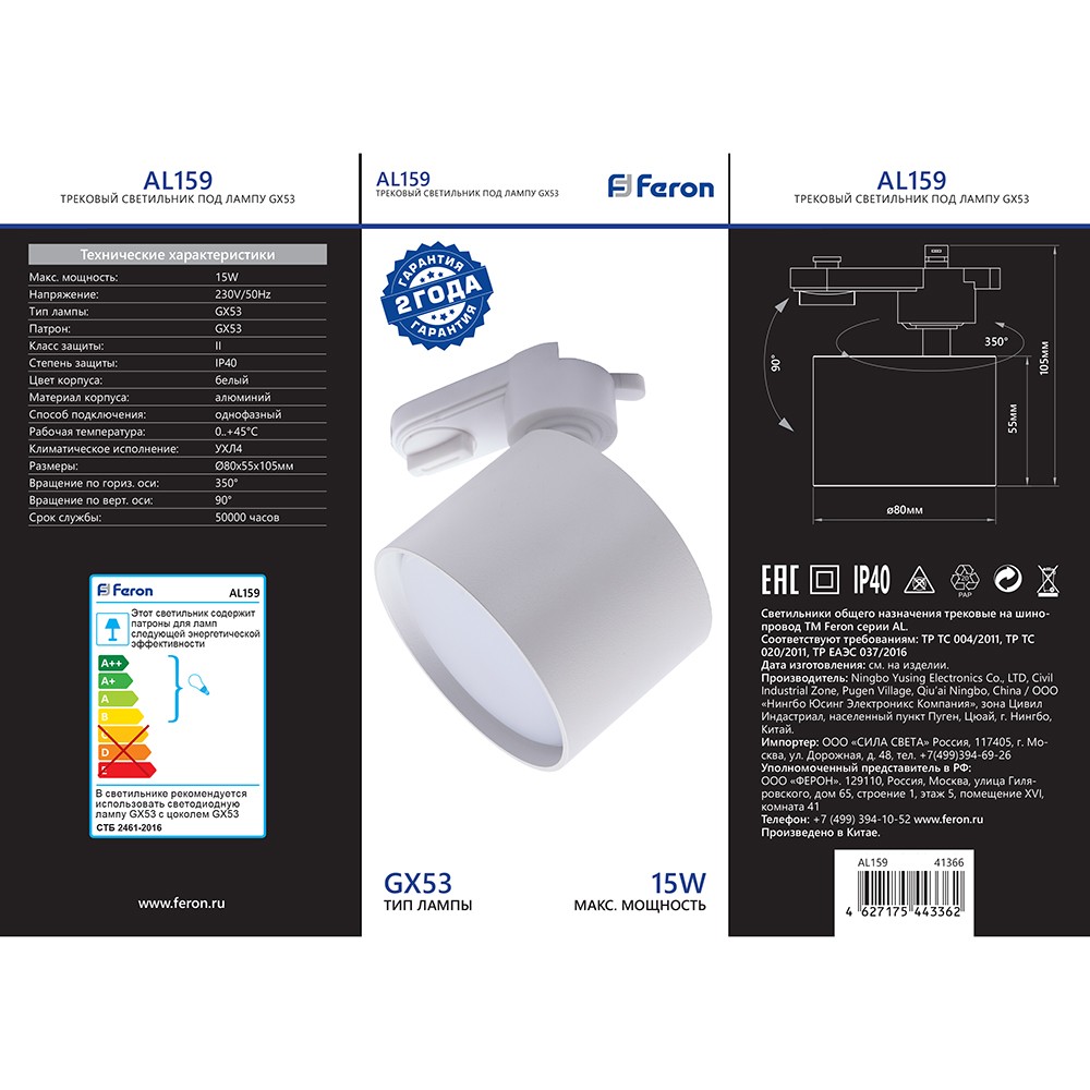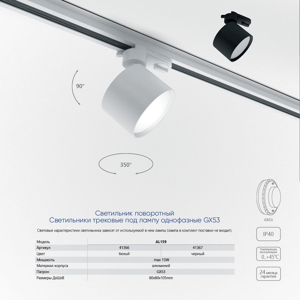 Светильник Feron AL159 трековый однофазный на шинопровод под лампу GX53 белый 41366 по цене 470 руб. с фотографией и техническими характеристиками. Для покупки товара нажмите кнопку "Купить" и перейдите в корзину или позвоните по телефону 8 (495) 585 32 60 или 8 (800) 222 23 53.