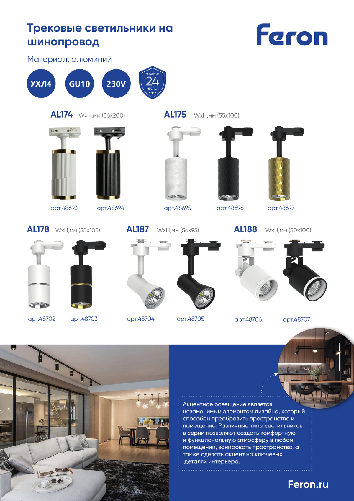 Выберите трековый светильник Feron AL174 для качественного и гибкого освещения в вашем пространстве.