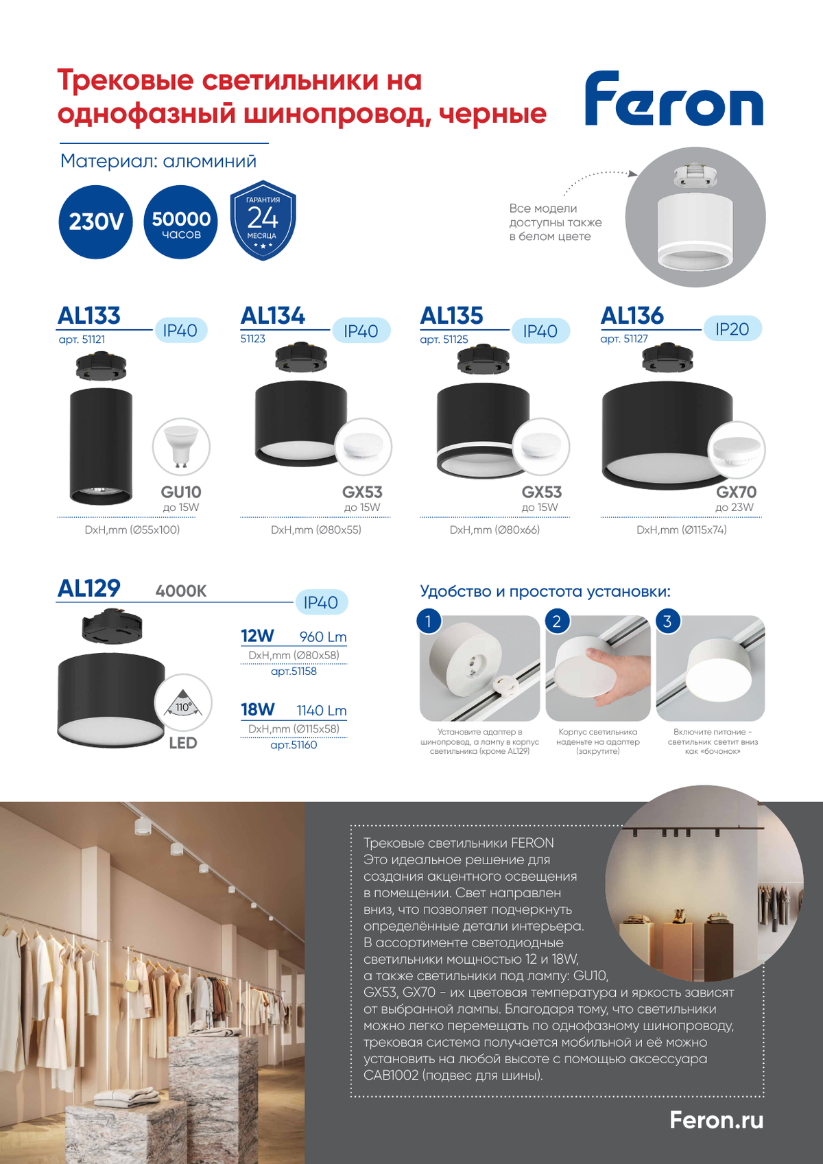 Светодиодный светильник Feron AL129 трековый на шинопровод 12W 4000K 110 градусов черный 51158 по цене 432 руб. с фотографией и техническими характеристиками. Для покупки товара нажмите кнопку "Купить" и перейдите в корзину или позвоните по телефону 8 (495) 585 32 60 или 8 (800) 222 23 53.