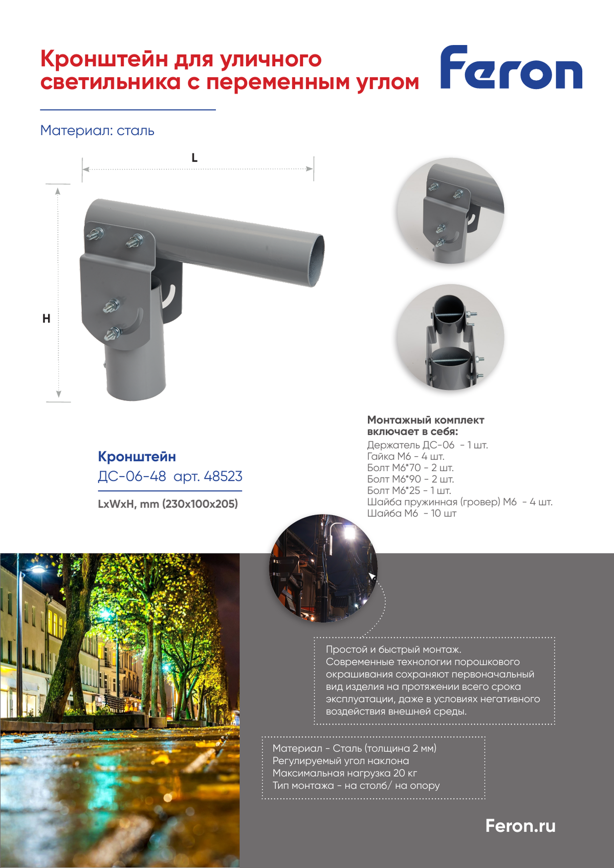 Кронштейн для уличных светильников ДС-06-48 (артикул 48523) от производителя Feron предлагает надежное решение для установки консольных осветительных приборов. Изготовленный из прочного материала, он обеспечивает долговечность и устойчивость к атмосферным воздействиям. Размеры 230x100x205 мм позволяют легко интегрировать его в различные архитектурные решения. Диаметр крепления 48 мм обеспечивает совместимость с большинством стандартных светильников, а возможность регулировки угла установки позволяет точно настраивать направление света. Серый цвет подходит для большинства внешних интерьеров, гармонично вписываясь в городской ландшафт. Этот кронштейн идеально подходит для использования в парках, на улицах и в других открытых пространствах, где необходима качественная и надежная подсветка.