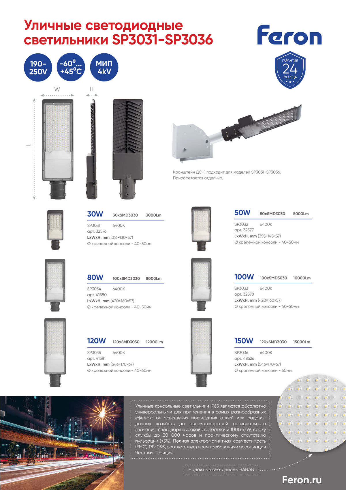 Светодиодный уличный консольный светильник Feron SP3031 30W 6400K 32576 по цене 1 160 руб. с фотографией и техническими характеристиками. Для покупки товара нажмите кнопку "Купить" и перейдите в корзину или позвоните по телефону 8 (495) 585 32 60 или 8 (800) 222 23 53.