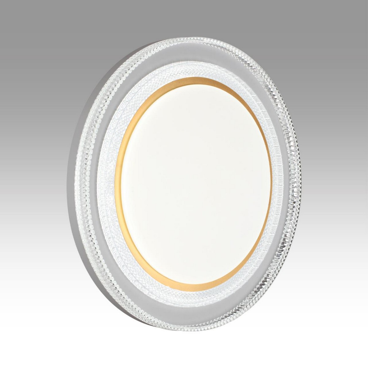 Светильник 7641/EL линии SUZY GOLD состоит из металлического основания (базы) и пластикового рассеивателя. Материал рассеивателя - высококачественный пластик марки PMMA 2.0 белого цвета с матовой поверхностью, без текстуры. Пластик обеспечивает светильнику равномерное рассеивание и хорошее светопропускание. Форма плафона: круглая, декорирована ободом "под хрусталь" из пластика прозрачного цвета. Обод украшен пластиковым кантом, цвет золото. Степень защиты IP43 позволяет использовать светильник в определенных зонах влажных помещений. В комплект входит заменяемый LED модуль с линзами, мощностью 70Вт, которая соответствует лампе накаливания 610Вт. А также пульт ДУ (с креплением на стену), с помощью которого осуществляется плавное изменение цветовой температуры 3000-6000К, изменение яркости, переход в режим переключения теплого/белого/холодного/ночного света. Светильник имеет функцию "память".