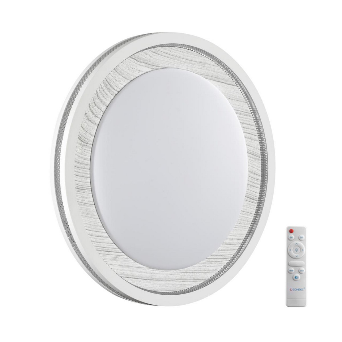 Светильник 7681/EL линии MAVI WOOD состоит из металлического основания (базы) и пластикового рассеивателя. Материал рассеивателя - высококачественный пластик марки PMMA 2.0 белого цвета с матовой поверхностью, без текстуры. Пластик обеспечивает светильнику равномерное рассеивание и хорошее светопропускание. Форма плафона: круглая, декорирована ободом из пластика светло-серого цвета "под дерево" с прозрачной вставкой "под хрусталь". Степень защиты IP43 позволяет использовать светильник в определенных зонах влажных помещений. В комплект входит заменяемый LED модуль с линзами, мощностью 70Вт, которая соответствует лампе накаливания 610Вт. А также пульт ДУ (с креплением на стену), с помощью которого осуществляется плавное изменение цветовой температуры 3000-6000К, изменение яркости, переход в режим переключения теплого/белого/холодного/ночного света. Светильник имеет функцию "память".