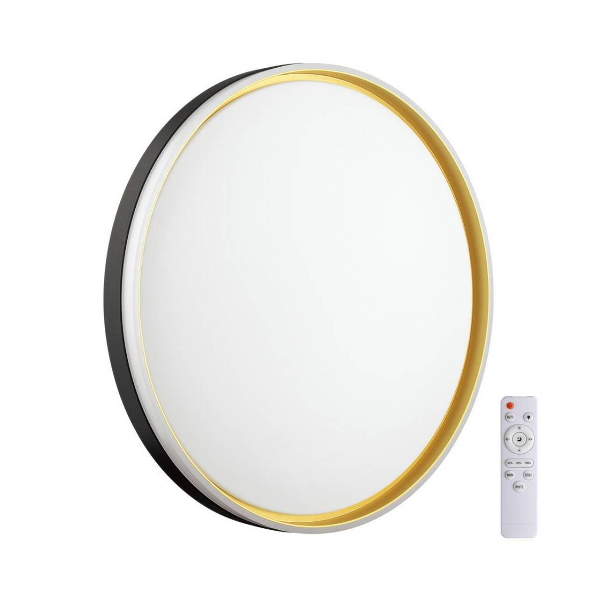 Светильник 7619/EL линии SAVI состоит из металлического основания (базы) и пластикового рассеивателя. Материал рассеивателя - качественный акрил белого цвета с матовой поверхностью, без текстуры. Пластик обеспечивает светильнику равномерное рассеивание и хорошее светопропускание. Форма плафона: круглая, декорирована ободом из пластика черного и золотистого цветов. Степень защиты IP43 позволяет использовать светильник в определенных зонах влажных помещений. В комплект входит заменяемый LED модуль с линзами, мощностью 72Вт, которая соответствует лампе накаливания 730Вт. А также пульт ДУ, с помощью которого осуществляется плавное изменение цветовой температуры 3000-6300К, изменение яркости, переход в режим переключения теплого/белого/холодного/ночного света. Светильник имеет функцию "память".