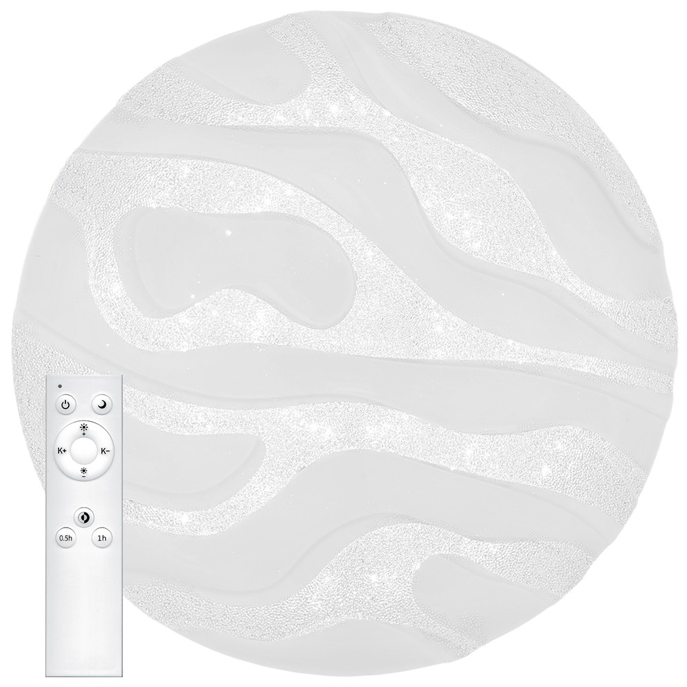 Светильник 7628/EL линии LOSTA состоит из металлического основания (базы) и пластикового рассеивателя. Материал рассеивателя - высококачественный пластик марки PMMA 2.0 белого цвета с матовой поверхностью, обеспечивающий светильнику равномерное рассеивание и хорошее светопропускание. Форма плафона: круглая, декорирована ободом из пластика под беленое дерево. Степень защиты IP43 позволяет использовать светильник в определенных зонах влажных помещений. В комплект входит заменяемый LED модуль с линзами, мощностью 72Вт, которая соответствует лампе накаливания 730Вт. А также пульт ДУ, с помощью которого осуществляется плавное изменение цветовой температуры 3000-6300К, изменение яркости, переход в режим переключения теплого/белого/холодного/ночного света. Светильник имеет функцию "память".