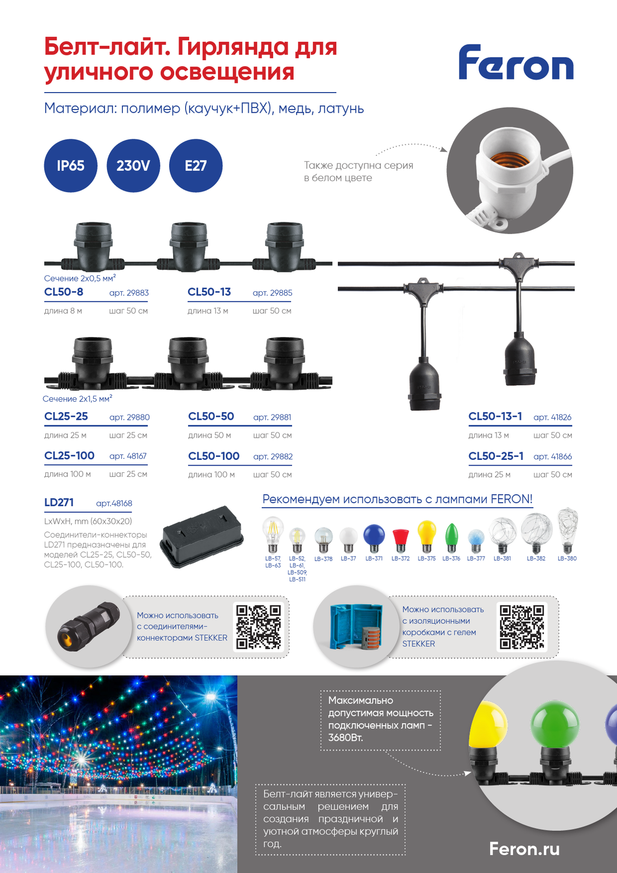 Белт-лайт Feron CL50-100 200 шт E27 шаг 50 см черный 100 м и 15 м шнур IP65 по цене 343 руб. с фотографией и техническими характеристиками. Для покупки товара нажмите кнопку "Купить" и перейдите в корзину или позвоните по телефону 8 (495) 585 32 60 или 8 (800) 222 23 53.