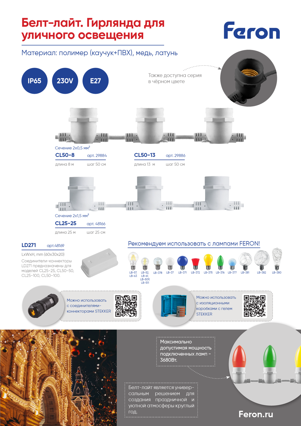 Гирлянда "Белт-лайт" FERON 48166, 25м+1,5м сетевой шнур, цвет белый, патрон E27*100, шаг 25см, 230ВV/50Гц, 16А, IP65, max 37W, сечение 2*1,5мм², материал: каучук,медь,ПВХ,латунь