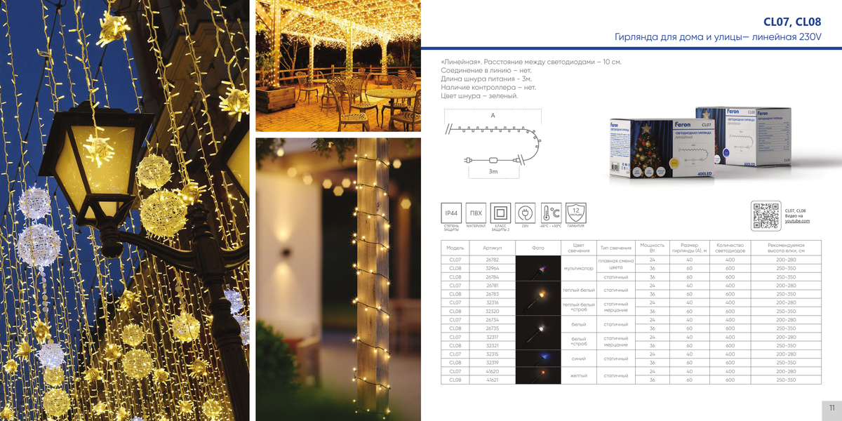 Гирлянда линейная FERON CL08, 600LED, 2700К (теплый белый), с эффектом стробов, 60м+3м зеленый шнур, расстояние между светодиодами 10см, IP44, 36W, от сети 230V, последовательное подключение - НЕТ