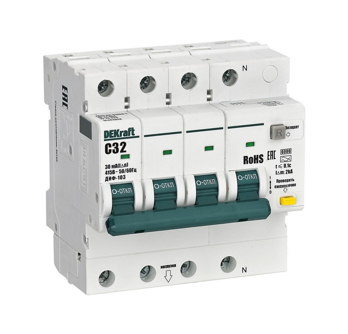 Автоматические выключатели дифференциального тока серии ДИФ-103 6кА NEW Dekraft; 3P+N; номинальный ток 32 А; ном. диф. ток 30 мА; тип диф. расцепителя - AC; кривая отключения - С; Icn, Ics = 6 кА; тип устройства - электронный; монтаж – на DIN-рейку. АВДТ обеспечивают три вида защиты - от короткого замыкания, перегрузки и возникновения утечки тока (в частности, вследствие прикосновения человека к токоведущим частям).