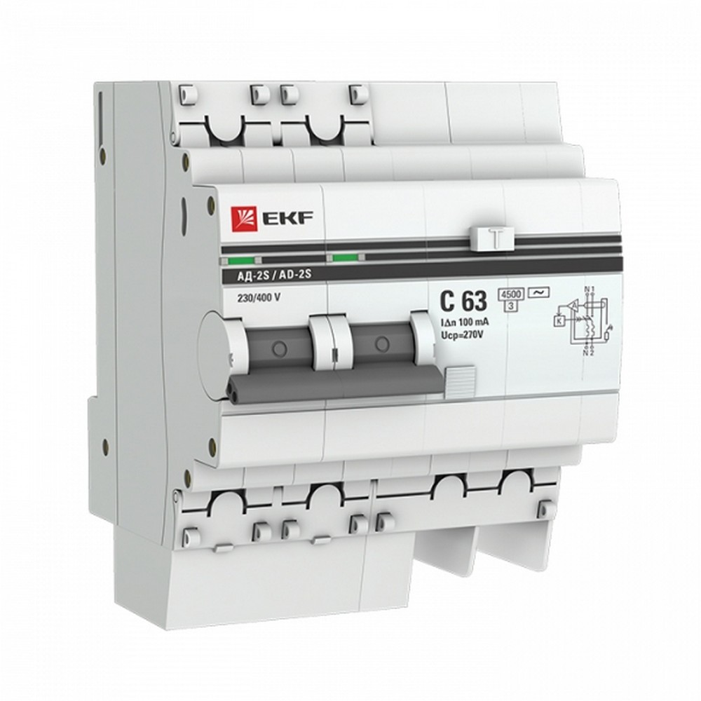 **Дифференциальный автомат EKF PROxima АД-2 (C) 63А/100мА тип АС 4,5кА (артикул: DA2-63-100S-pro)**