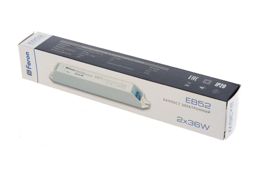 Аппарат пускорегулирующий FERON EB52 2*36W T8/G13 230V электронный ПРА 195*33*25мм используется для подлючения люминесцентных ламп и светильников