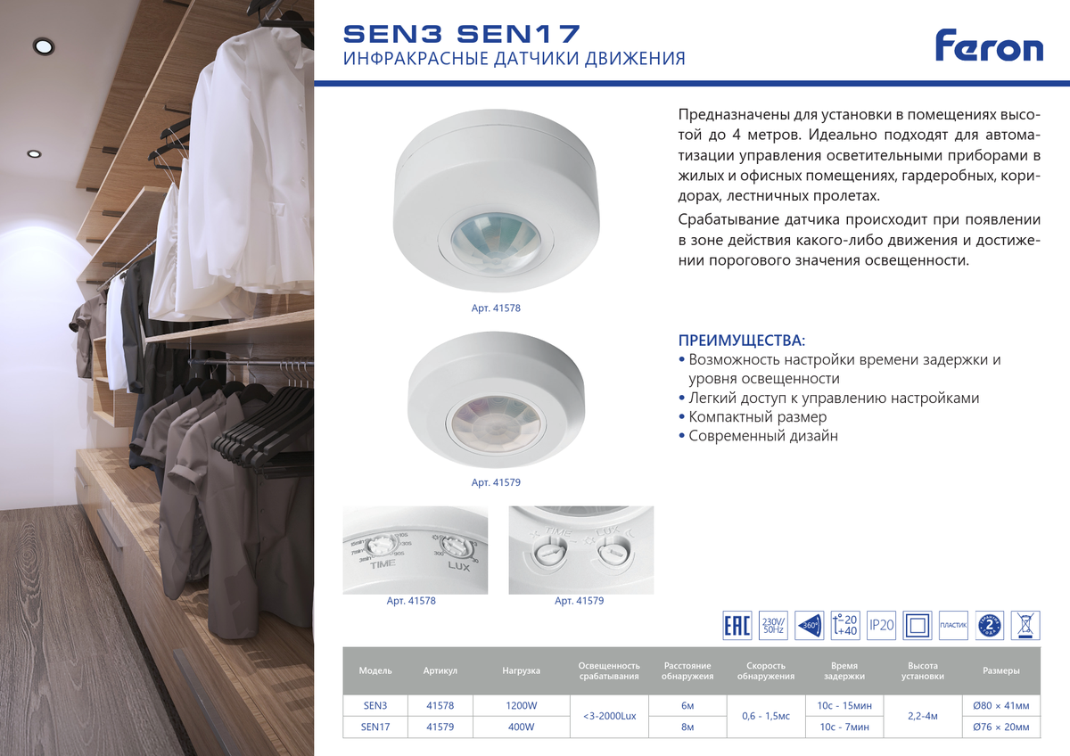 Датчик движения и освещенности FERON SEN17 инфракрасный, потолочный, IP20, 230V, 400, расстояние обнаружения 8м, угол обнаружения 120°(гориз.), 360°(верт.), с регулировкой освещенности и времени задержки, цвет белый, 76*76*20,2мм