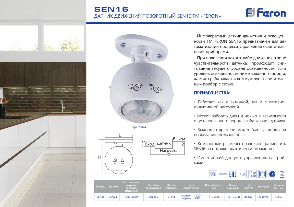 Датчик движения и освещенности FERON SEN16 инфракрасный, накладной, IP20, 230V, 1200W, расстояние обнаружения 8м, угол обнаружения 120°(гориз.), 360°(верт.), с регулировкой освещенности и времени задержки, цвет белый, 45*45*53мм