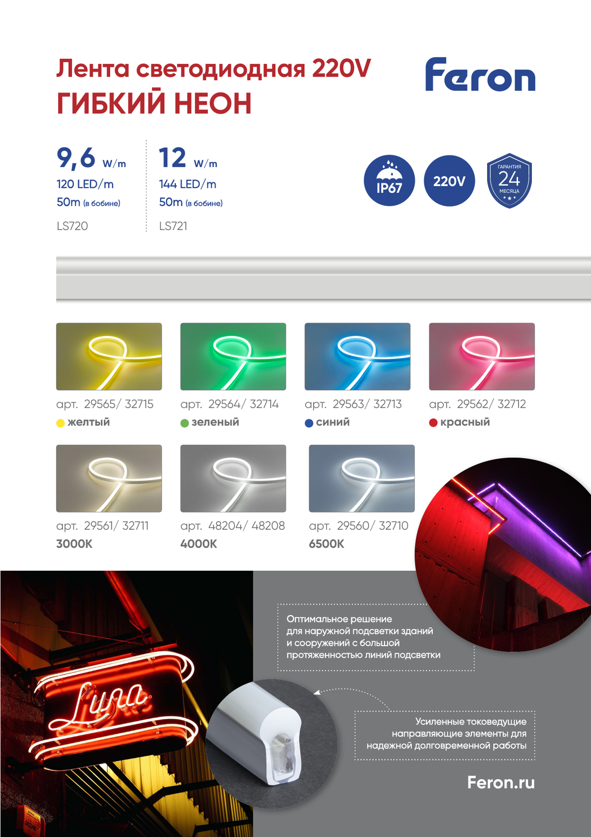 С защитой IP67, этот светодиодный неон прекрасно подходит для использования как внутри помещений, так и на улице, даже в неблагоприятных погодных условиях. Рекомендуется для создания атмосферного освещения в кафе, ресторанах, на выставках и в интерьере жилья. С Feron LS720 вы получите стильное и функциональное освещение, которое прослужит долго.