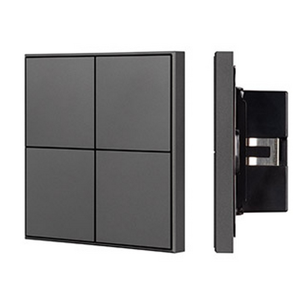 Универсальная многофункциональная встраиваемая настенная панель для систем KNX. 4 рокерные клавиши, 1 клавиша может выполнять функции 2-х клавиш. Тонкая рамка, материал - алюминий, отклик вибрацией, светодиодная индикация. Цвет корпуса - титановый чёрный. Питание от шины KNX DC 21-30V. Габариты 86x86x33 мм.