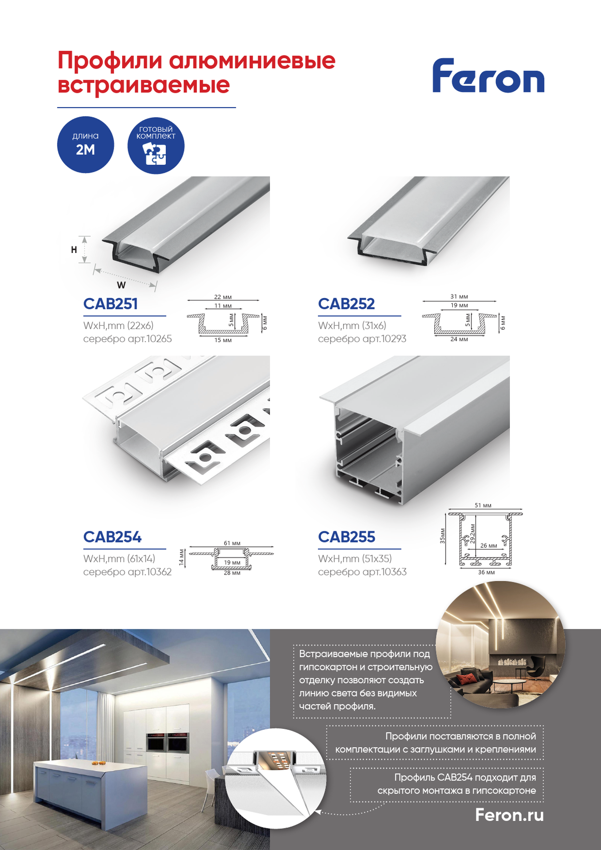 Профиль для светодиодной ленты Feron CAB252 — это идеальное решение для создания стильного и современного освещения. Его алюминиевая конструкция и серебристый цвет прекрасно вписываются в любой интерьер, добавляя элегантности. С размерами 2000*31*6 мм профиль подходит для встраивания в потолки, стены или мебель, что позволяет эффективно скрыть светодиодную ленту и защитить её от повреждений.