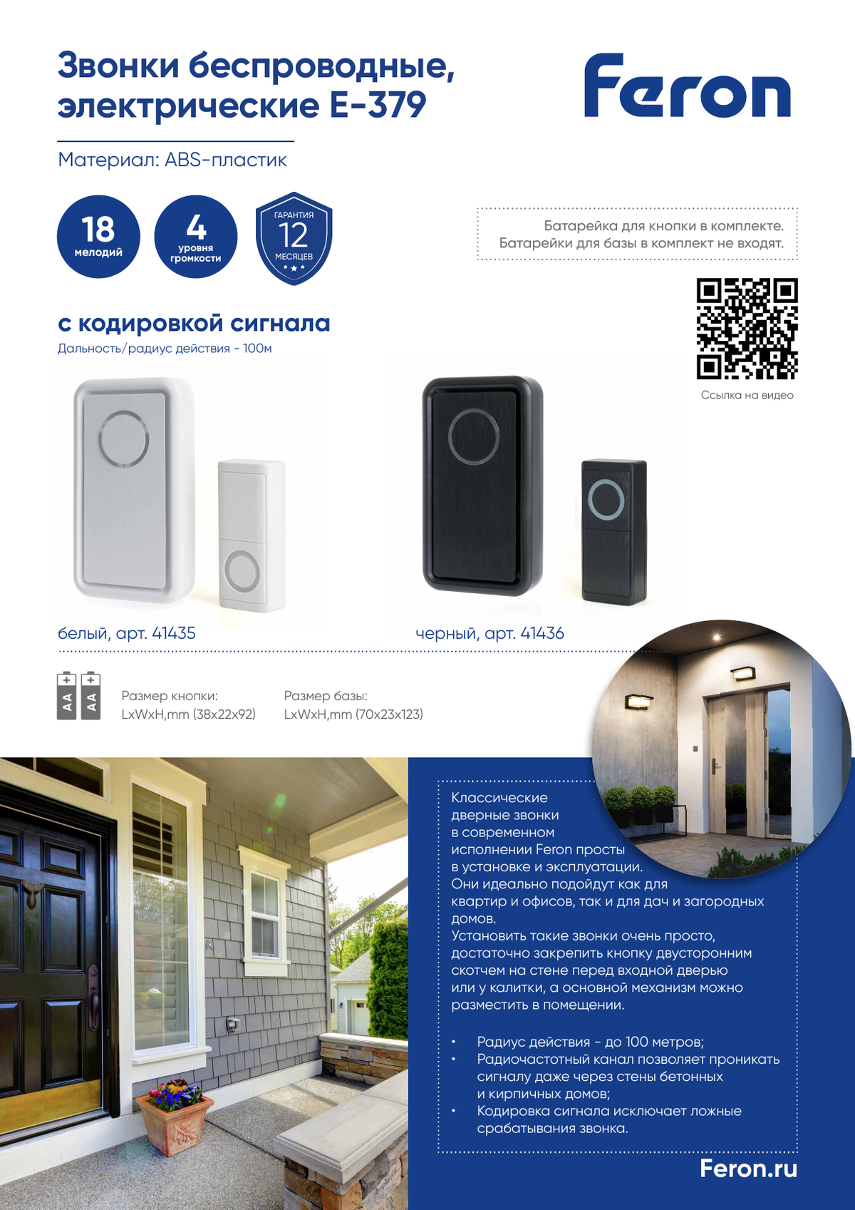 Беспроводные дверные звонки Feron E-379 артикул 41436 экономичны и просты в установке и эксплуатации. Они идеально подойдут как для квартир и офисов, так и для дач и загородных домов.