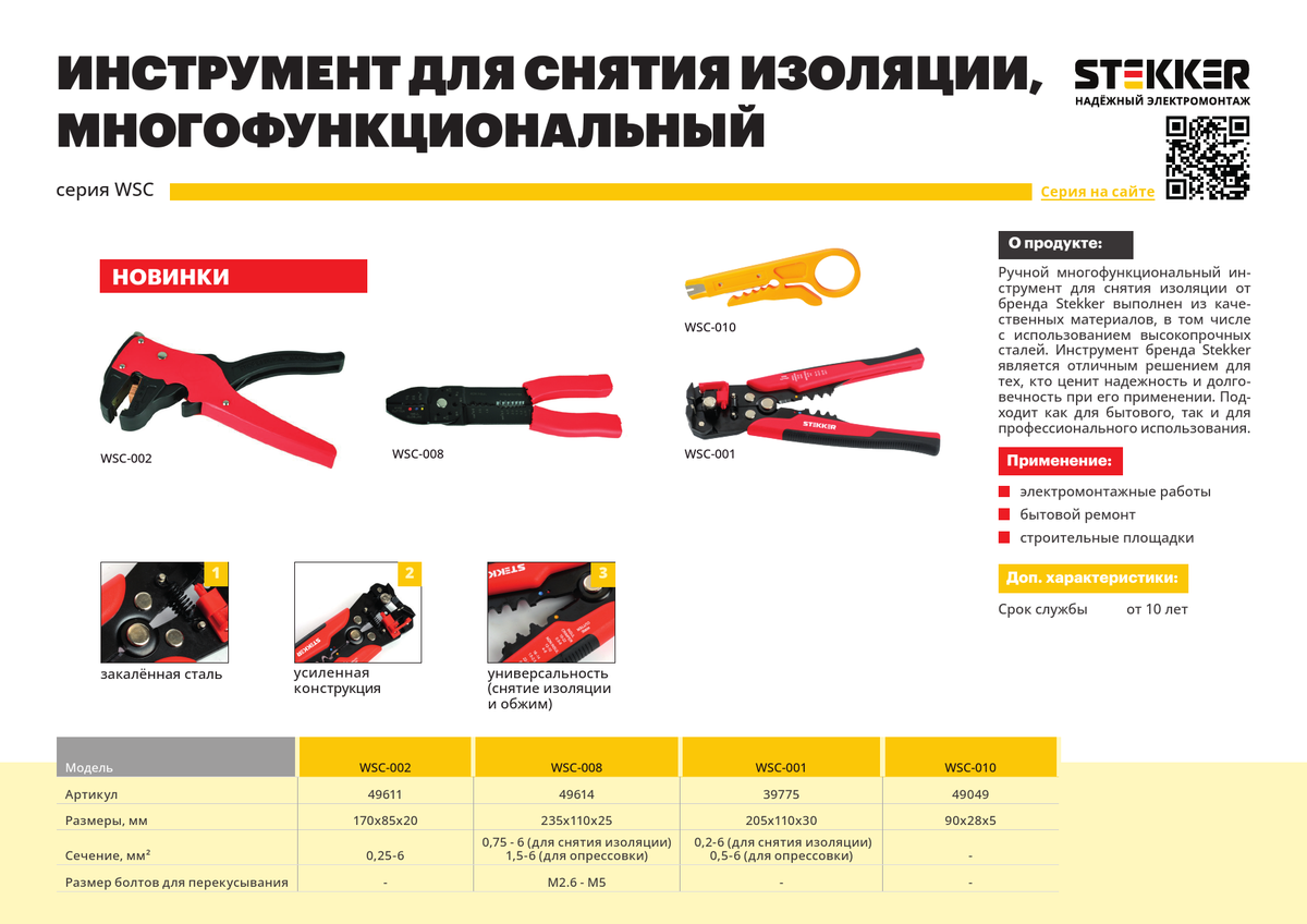 Автоматический многофункциональный инструмент для зачистки кабеля (стриппер) STEKKER WSC-001 39775 по цене 1 101 руб. с фотографией и техническими характеристиками. Для покупки товара нажмите кнопку "Купить" и перейдите в корзину или позвоните по телефону 8 (495) 585 32 60 или 8 (800) 222 23 53.