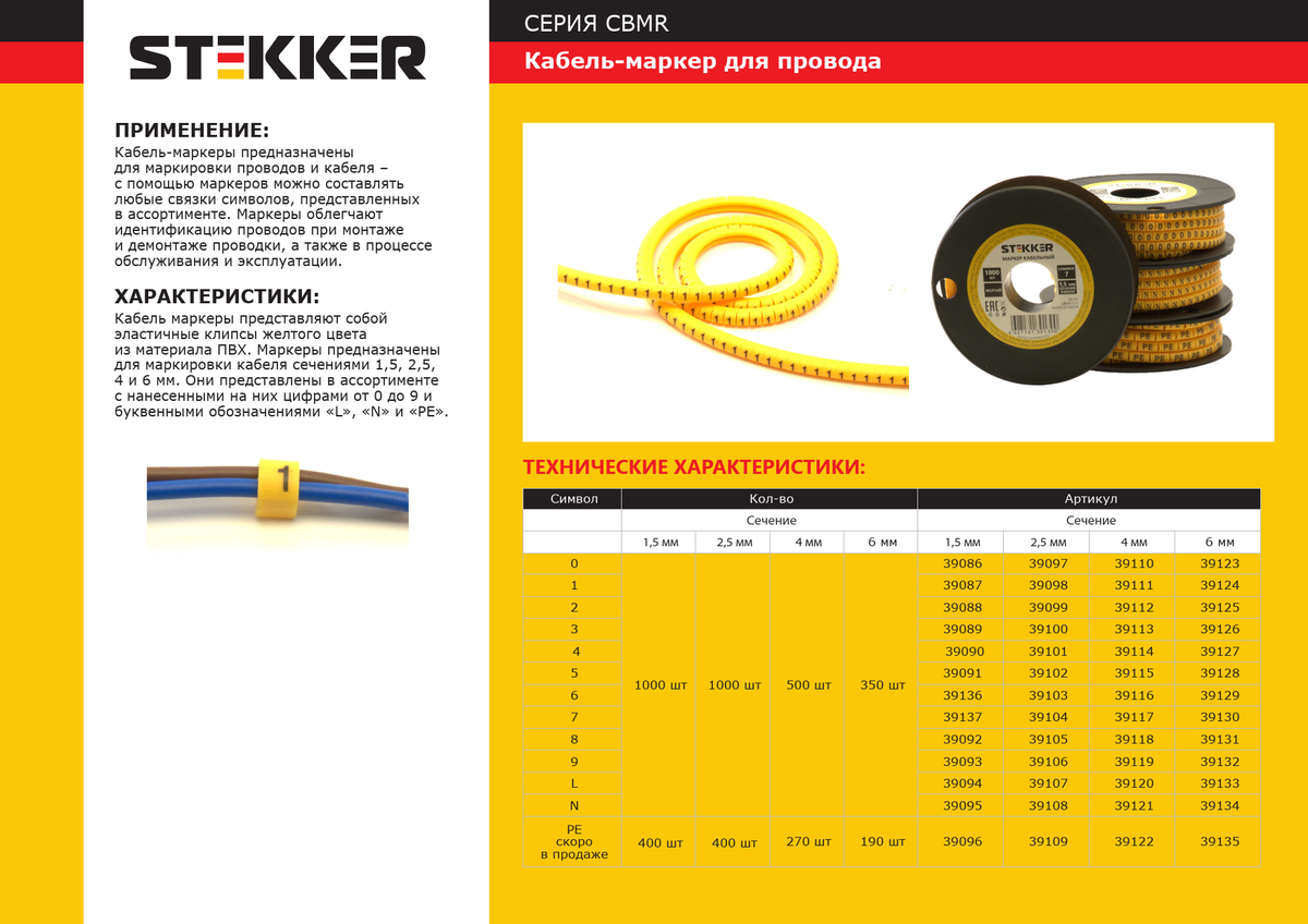 Кабель маркер на бобине электромонтажный STEKKER CBMR40-4, , желтый, материал - ПВХ, размер 98*98мм, максимальный диаметр пучка - мм, нагрузка - кг, диапазон рабочих температур -10°C - +40°C, рекомендуемая температура хранениня