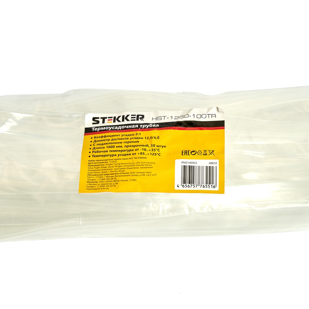Термоусадочные трубки STEKKER HST-1260-100TR, длина 1000мм. 50шт. в наборе, цвет: прозрачный. Коэффициент усадки 2:1, диапазон рабочих температур -10..+35°C, температура усадки +85..+125°C, номинальный ток 32А, для проводов сечением мм2.