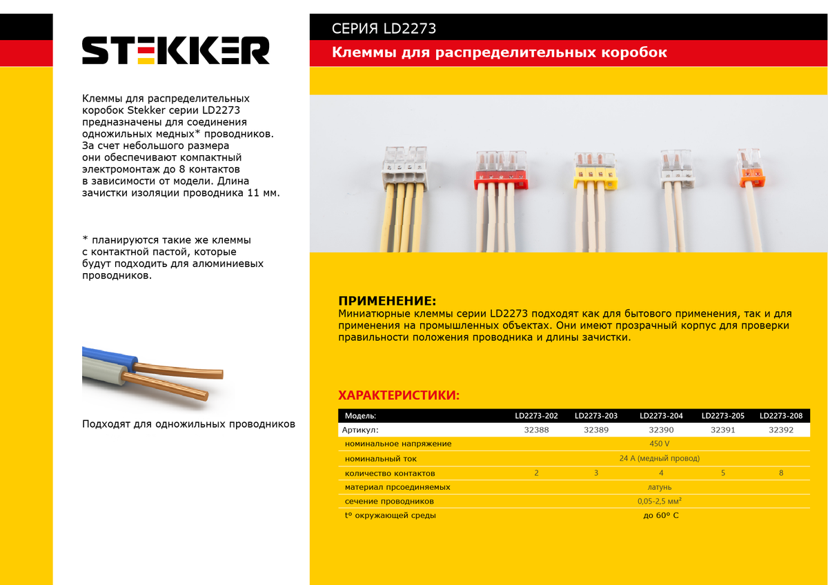 Клемма пружинная компактная STEKKER LD2273-204, 4-проводная 0,5-2,5 мм2, 450В, 24A, без пасты, материал изделия поликарбонат, латунь, сталь. Тип провода одножильный, материал провода медь, температура окружающей среды -20...+40°C